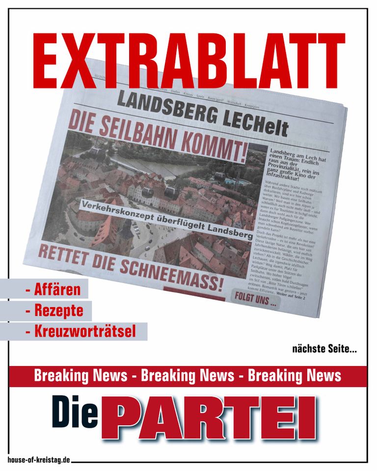 Wir, die PARTEI, wünschen angemeldete Demonstrationen (nach Artikel 8 (2) GG, und dem Versammlungsgesetz BGBI I S.1789) sowie eine umgehende Entspazifizierung des Landkreises.